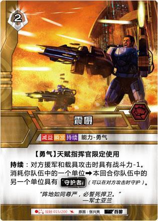 【勇气】天赋指挥官限定使用 持续:对方援军和载具攻击时具有战斗力-1。消耗你队伍中的一个单位→本回合你队伍中的另一个单位具有【守护者】(可以在对方攻击时守护)。